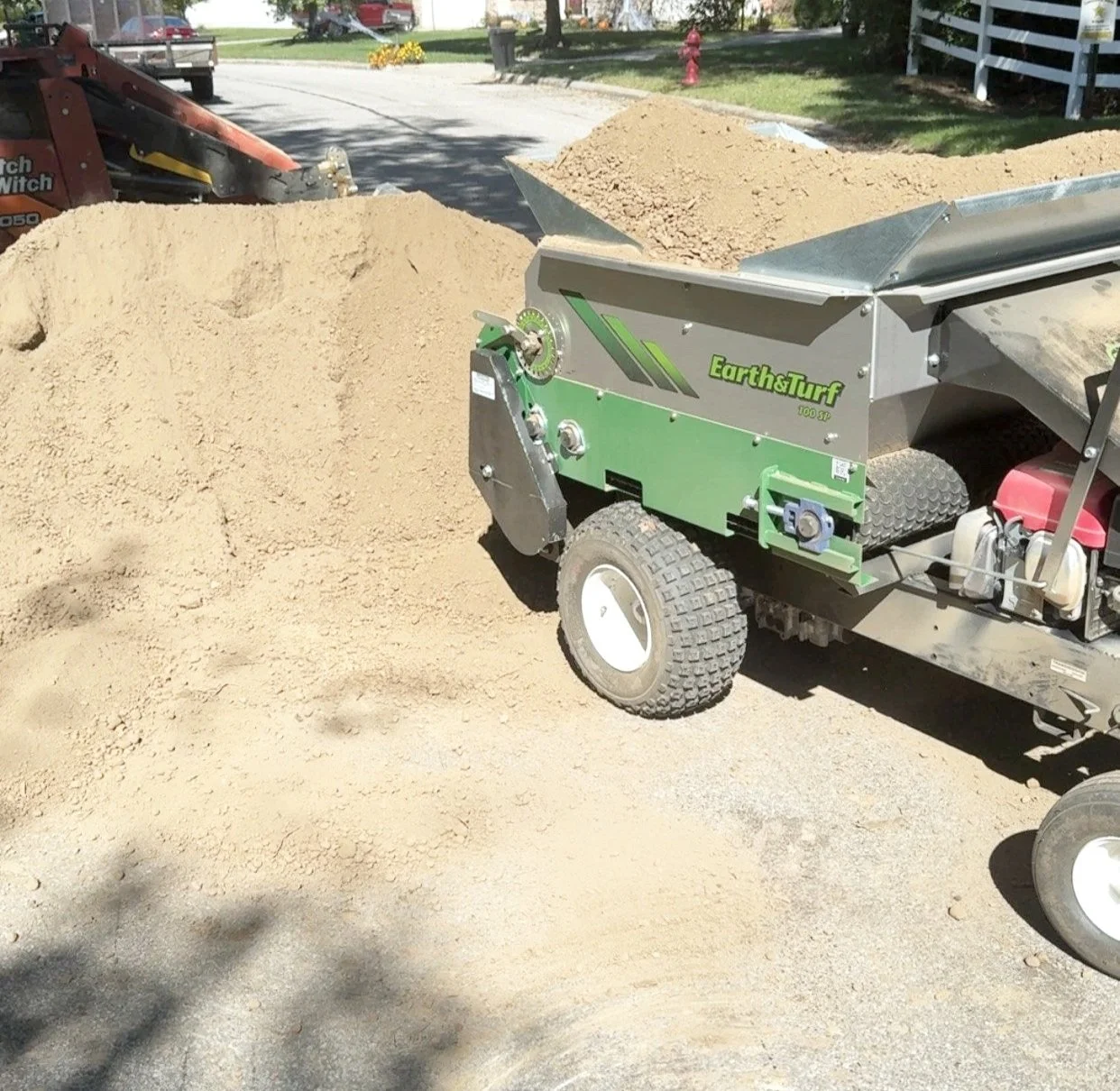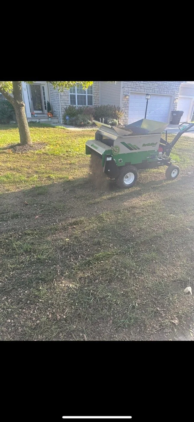 Our pull behind machine allows us to evenly disperse 1/4” of pulverized topsoil over the entire area before applying seed.